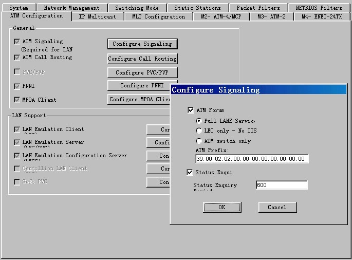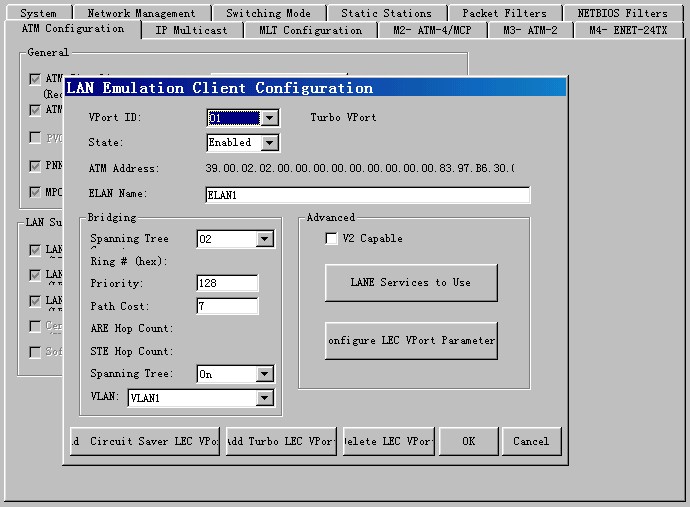 解決了以上兩個問題,剩下的就是交換機及客戶端的配制。在ATM這一層,考慮到只設一個網(wǎng)段,為保證在路由模板故障一處理完,就能馬上恢復,所以在配制ATM時,只把5000BH上的各個端口劃到VLAN1中,以此來保證恢復時的快速性。以下是配制圖例。