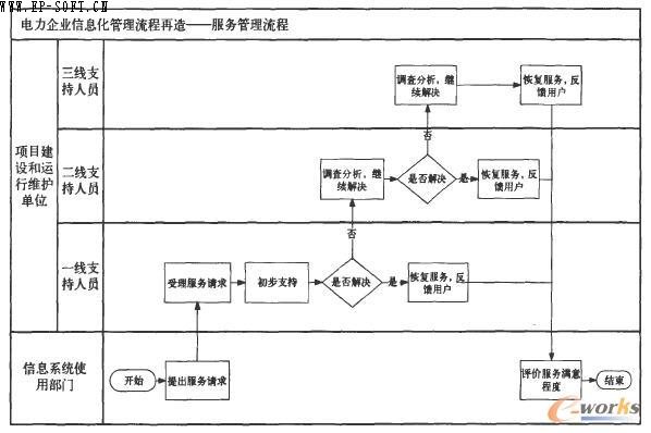 電力企業(yè)信息化管理實施流程再造后,可以改善信息化管理過程中服務(wù)管理、能力管理、需求管理、項目管理、問題及事故管理、變更管理、質(zhì)量管理、績效與評價等流程。可以通過需求管理流程,收集業(yè)務(wù)部門對項目建設(shè)、運行維護、系統(tǒng)變更等方面的具體需求,統(tǒng)一管理。可以通過服務(wù)管理流程,向業(yè)務(wù)部門提供信息化管理服務(wù)的申告、投訴平臺,提高項目建設(shè)、故障處理等信息化管理事件的響應(yīng)速度。可以通過問題及故障處理和變更管理流程,為信息化管理專業(yè)技術(shù)人員提供標(biāo)準(zhǔn)的故障處理和系統(tǒng)變更操作規(guī)范和具體步驟,進一步提高了處理問題、解決問題的能力??梢酝ㄟ^項目管理流程,規(guī)范項目從立項、可行性研究、初步設(shè)計到項目執(zhí)行、驗收等項目建設(shè)全過程,有效控制項目建設(shè)的質(zhì)量和進度。再輔之以能力管理、質(zhì)量管理和績效與評價流程,對信息化管理部門的工作能力和績效進行評價,對信息化管理過程進行質(zhì)量監(jiān)控,通過持續(xù)改進和不斷完善,可以有效改善電力信息化管理中存在的問題。在引入服務(wù)管理、能力管理和績效與評價管理流程之后,一方面影響信息化管理能力和效率的技術(shù)人員的因素降低了,取而代之的是標(biāo)準(zhǔn)化流程和規(guī)范化作業(yè),輔之以知識庫和經(jīng)驗庫;另一方面通過有效地管理將專業(yè)技術(shù)人員從“救火隊”式的工作方式下解放出來,投入到專業(yè)知識的積累和專業(yè)技能的提升中,使信息化管理團隊的整體水平進一步提高。