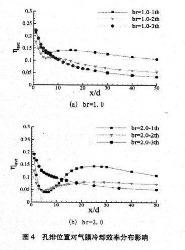 圖4給出了在吹風(fēng)比為1.0和2.0時(shí),所對(duì)應(yīng)的孔下游氣膜冷卻效率隨x/d的變化情況。圖4(a)是在br=l.0時(shí),x/d<7,第3排孔冷卻效率最高,因?yàn)榈?排孔孔徑最大且孔間距最小,同樣的吹風(fēng)比下,能更好的實(shí)現(xiàn)氣膜覆蓋。x/d>10時(shí),第1排孔冷卻效率最高。第3排孔冷卻效率最低,這是因?yàn)榈?排孔離滯止線最遠(yuǎn),第3排孔離滯止線最近。當(dāng)氣膜孔位置后移時(shí),所對(duì)應(yīng)的主流區(qū)的速度也變大,相對(duì)減弱了吹風(fēng)比的影響。圖4(b)是br2=0時(shí),第1,2,3排孔展向平均氣膜冷卻效率隨x/d的變化。x/d<12時(shí),第3排孔的冷卻效率最高,這說(shuō)明吹風(fēng)比增大,會(huì)加強(qiáng)孔徑和孔間距對(duì)氣膜冷卻效率的影響。5