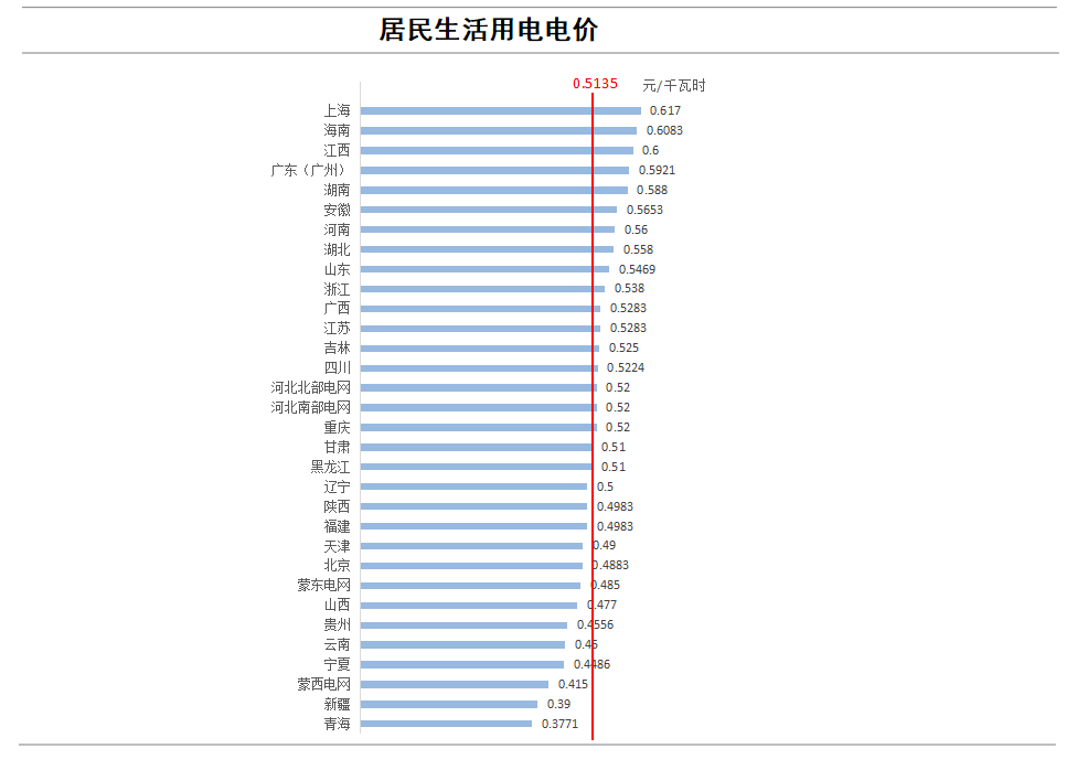 全國居民生活用電平均電價約為0.5135元/千瓦時,其中,上海最高為0.617元/千瓦時,青海最低為0.3771元/千瓦時。