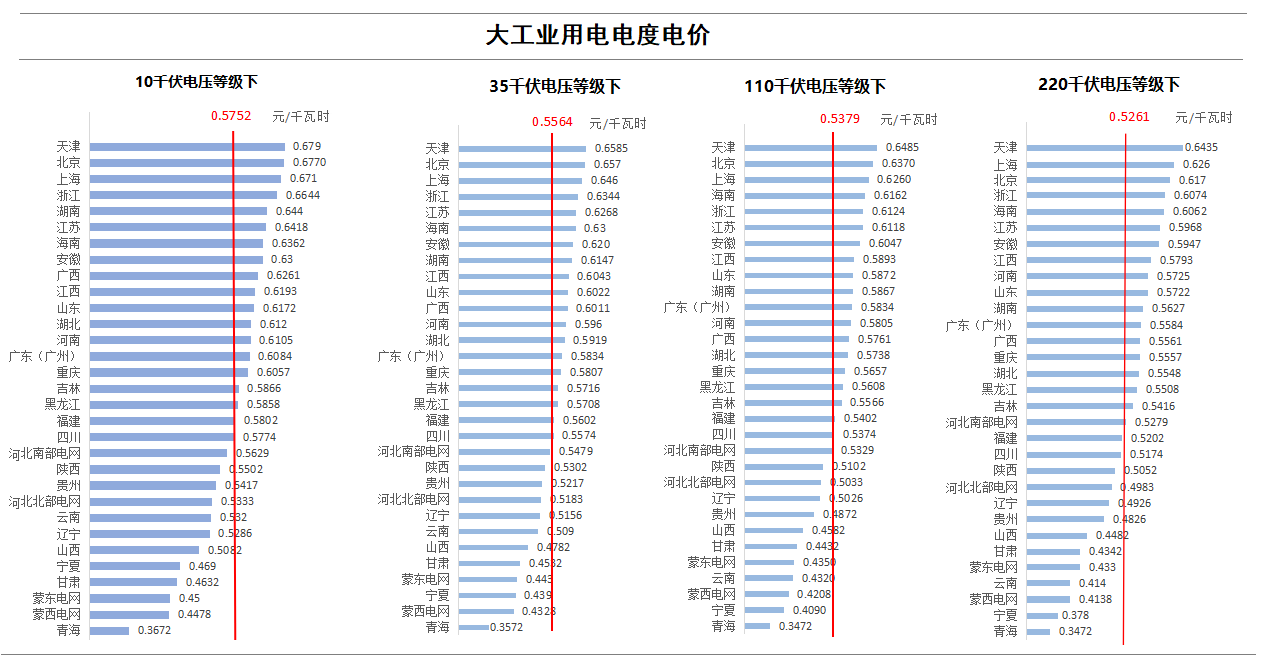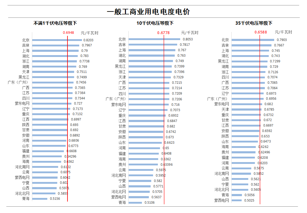 不滿1千伏電壓等級下,全國平均電價約為0.6948元/千瓦時,其中,北京最高為0.8203元/千瓦時,青海最低為0.5156元/千瓦時。