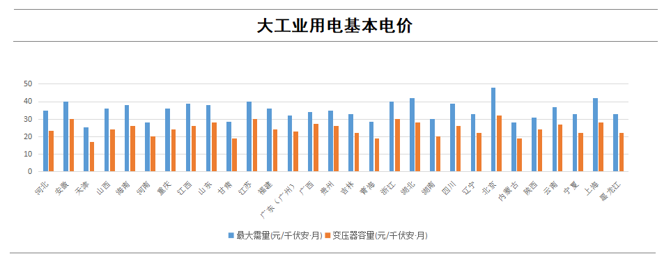 基本電價只有大工業(yè)用戶收取,分按最大需量和按變壓器容量收取。從基本電價的情況來看,按最大需量平均為35.1元/千瓦˙月,按變壓器容量平均約為24.4元/千瓦˙月,北京最高,天津最低。