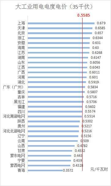 2、35千伏電壓等級下,全國平均電價約為0.5585元/千瓦時,其中,上海最高為0.679元/千瓦時,青海最低為0.3572元/千瓦時。