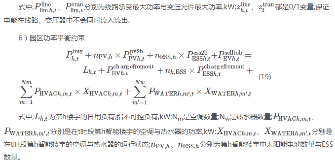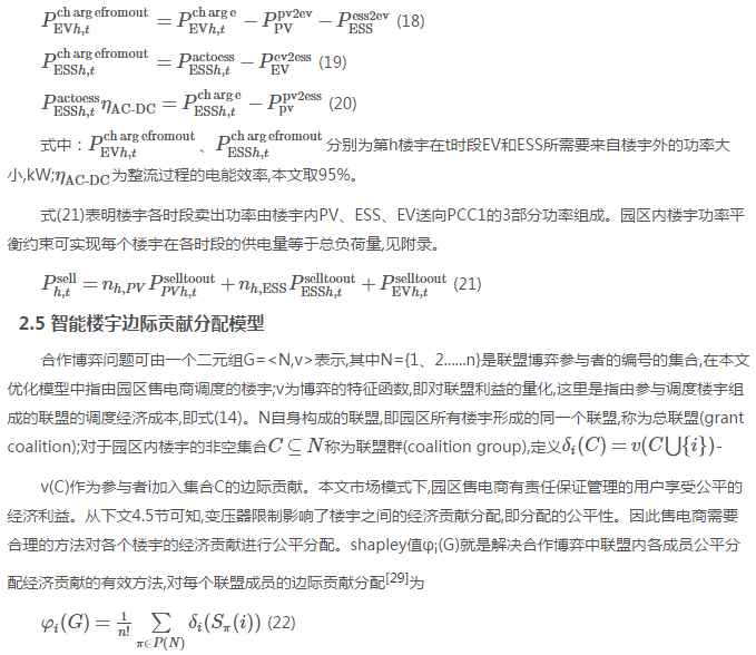 本文結(jié)合目前電力市場改革中可能出現(xiàn)的配售分離情形,提出了售電商在高比例分布式能源園區(qū)運營中可能承擔(dān)的新角色與新功能?;诖?針對含高比例分布式能源配置的智能樓宇組建的園區(qū)具有電能雙向流動性,各層次主體目標(biāo)多樣且相互制約以及配電變壓器功率越限問題,考慮交直流混合供電方式樓宇模型的功率流動并進行了細化,提出了售電商協(xié)調(diào)下的園區(qū)日前優(yōu)化調(diào)度模型。該模型在滿足EV用戶用電需求及用電費用最少的基礎(chǔ)上,同時滿足溫控負荷用戶的用電需求,實現(xiàn)園區(qū)內(nèi)電能共享,延長配電變壓器壽命,樓宇調(diào)度成本最低。通過算例分析,驗證了模型的可行性。并針對變壓器功率限制對園區(qū)各個樓宇的經(jīng)濟影響,基于合作博弈理論,提出采用shapley值合理分配各個樓宇的調(diào)度成本。