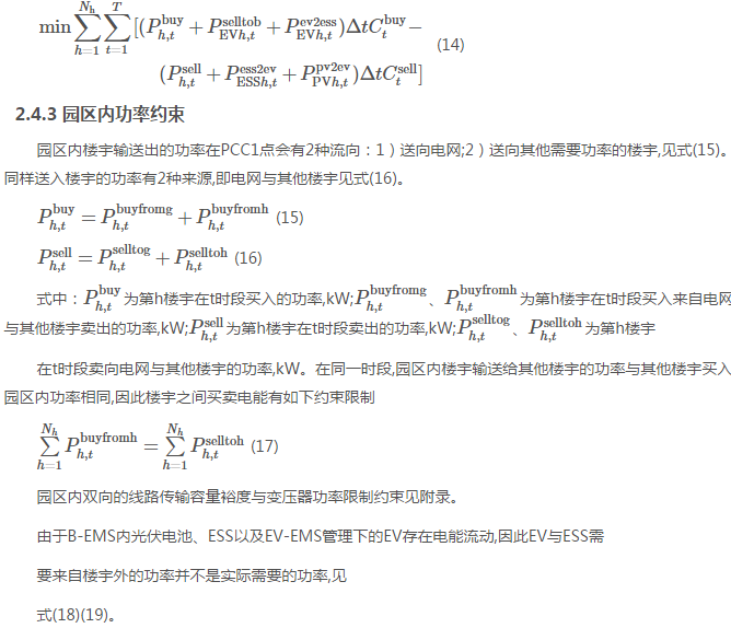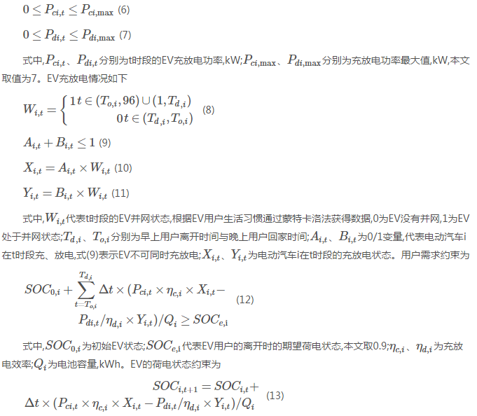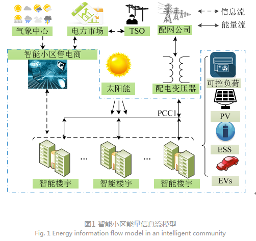 需求側(cè)響應(yīng)(demand response,DR)作為一種通過引導(dǎo)用戶主動參與電力市場使其用電行為發(fā)生改變的有效手段,在智能電網(wǎng)發(fā)展的大背景下實現(xiàn)源、網(wǎng)、荷、儲之間的互動具有重要地位[11-12]。有關(guān)研究指出目前的居民用電量比重越來越大、用電行為難以把握[13],因此需求側(cè)響應(yīng)的開展不再拘泥于工業(yè)園區(qū),家庭能源管理[13-14]與智能樓宇建設(shè)[15]的研究相繼成為我國需求側(cè)發(fā)展的熱點。目前針對居民智能小區(qū)的研究如下。文獻[16]研究了動態(tài)電價引導(dǎo)空調(diào)系統(tǒng)使用戶用電費用最少的優(yōu)化調(diào)度方法;文獻[17]在用戶的舒適度和負荷調(diào)整空間基礎(chǔ)上建立了直接負荷控制(direct load control,DLC)的空調(diào)負荷雙層優(yōu)化調(diào)度和控制模型;文獻[18-20]都是基于分時電價(time of use,TOU),在滿足EV用戶用電需求的同時有效地減少充電費用,最終實現(xiàn)削峰填谷、降低負荷方差;文獻[21]協(xié)調(diào)基于TOU與DLC的主動需求響應(yīng),綜合考慮EV用戶充電需求和配網(wǎng)負荷水平進行研究;文獻[7]把含有光伏的樓宇與電網(wǎng)側(cè)視為多個決策者進行非合作博弈,提出了一種基于光伏電能供需比的內(nèi)部價格模型,實現(xiàn)各經(jīng)濟主體有序電能交易。但文獻[7,16-21]沒有考慮用電設(shè)備之間的相互配合影響。文獻[22]將PV、EV、ESS協(xié)調(diào)控制,實現(xiàn)家庭能源管理用電費用最低;文獻[23]考慮了PV,可控負荷與EV充放電的聯(lián)合調(diào)度,實現(xiàn)了PV消納與經(jīng)濟最優(yōu)調(diào)度;文獻[24]考慮ESS、溫控負荷、EV,基于用戶側(cè)用電行為聚類分析,采用行為矯正的混合粒子群優(yōu)化算法實現(xiàn)需求響應(yīng)模型的互動化方法求解。但文