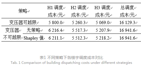 售電商是否考慮變壓器的功率限制的調(diào)度策略只在園區(qū)購買電網(wǎng)功率上存在著差異,售電功率并沒有受到影響,見圖8。由目標(biāo)函數(shù)式(14)可知售電商的日前調(diào)度實際上是實現(xiàn)所有樓宇的調(diào)度成本最小。如果變壓器功率限制為無窮大,那么每個樓宇在售電商的管理下都會實現(xiàn)自身調(diào)度成本最小。但是,由于存在變壓器的功率限制,實現(xiàn)目標(biāo)函數(shù)時無法考慮園區(qū)內(nèi)各個樓宇的調(diào)度成本,導(dǎo)致售電商無法根據(jù)樓宇的邊際貢獻對樓宇進行公平分配,因此采用shapley值是必要的。不同的調(diào)度策略下樓宇調(diào)度成本見表1。