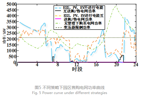 在不同策略下園區(qū)內(nèi)所有樓宇從電網(wǎng)側(cè)購、售功率情況對比見附錄圖5。無管理模式是指樓宇內(nèi)未安裝ESS、PV,同時溫控負荷在居民需求時段持續(xù)用電,EV并網(wǎng)后以最大功率充電直到充滿停止。由附錄圖5可知,無管理模式下負荷功率對配電變壓器的安全運行造成嚴重影響。在不受變壓器限制功率情況下,從樓宇內(nèi)ESS、PV、EV之間是否進行電能互送對比,說明樓宇內(nèi)電能相互流動可以有效減少園區(qū)與電網(wǎng)側(cè)來往功率,即減少了遠距離輸送電能帶來的損失。