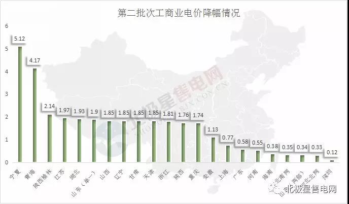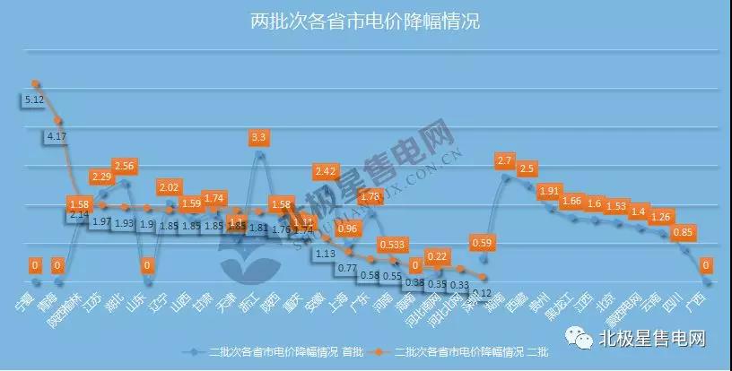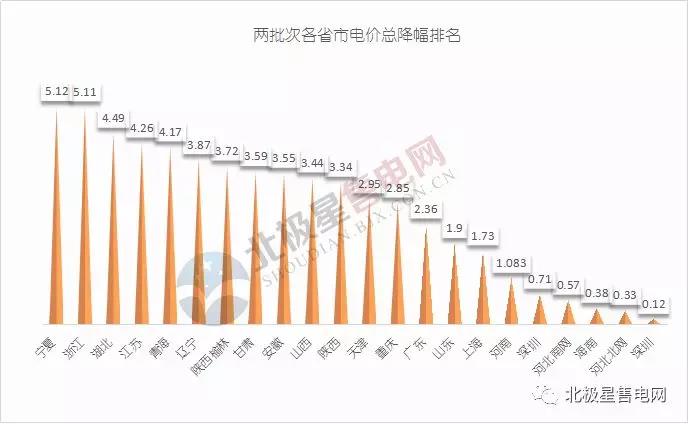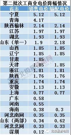 從兩批次降電價(jià)總體情況來(lái)看,寧夏以5.12分的最大降幅位列全國(guó)首位,其次為浙江,在首批降電價(jià)方案中,浙江宣布降低省一般工商業(yè)及其他用電目錄電價(jià)和輸配電價(jià)每千瓦時(shí)3.3分(含稅),而在第二批降電價(jià)方案里,浙江再次將一般工商業(yè)及其他用電目錄電價(jià)和輸配電價(jià)降1.81分/千瓦時(shí),兩批次降幅合計(jì)在5.11分,位列降幅榜第二位,也成為目前降幅在5分以上的兩省份之一。排在第三位的湖北省在第一批降電價(jià)方案里,湖北省一般工商業(yè)及其他用電目錄電價(jià)及輸配電價(jià)同降0.0256元/千瓦時(shí),第二批湖北降低一般工商業(yè)及其他用電目錄電價(jià)、輸配電價(jià)0.0193元/千瓦時(shí),兩批次降幅達(dá)到4.49分。