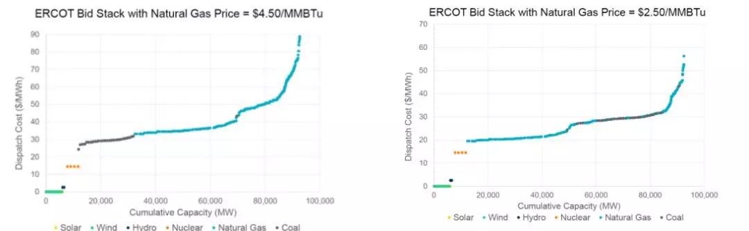 當(dāng)然以德州的經(jīng)驗(yàn)而言,新能源的介入對(duì)現(xiàn)貨的價(jià)格影響很大。目前德州主要以燃?xì)鈾C(jī)組為主,電價(jià)必然跟天然氣價(jià)格關(guān)聯(lián)度會(huì)比較高。當(dāng)天然氣價(jià)格是4.5美元/MMBTu的時(shí)候,煤電就有價(jià)格的優(yōu)勢,它在報(bào)價(jià)的低端,這個(gè)時(shí)候系統(tǒng)多數(shù)出清機(jī)組由煤電機(jī)組決定,煤電機(jī)組有一定的盈利空間;當(dāng)天然氣價(jià)格下降到2.5美元/MMBTu的時(shí)候,報(bào)價(jià)會(huì)發(fā)生很大的變化,這時(shí)候有可能是燃?xì)鈾C(jī)組決定出清價(jià)格,但是這個(gè)時(shí)候煤電的價(jià)格到了中部,損害了煤電的經(jīng)濟(jì)性和有效性,它有可能不會(huì)被市場所接受,或者被迫要接受損失。