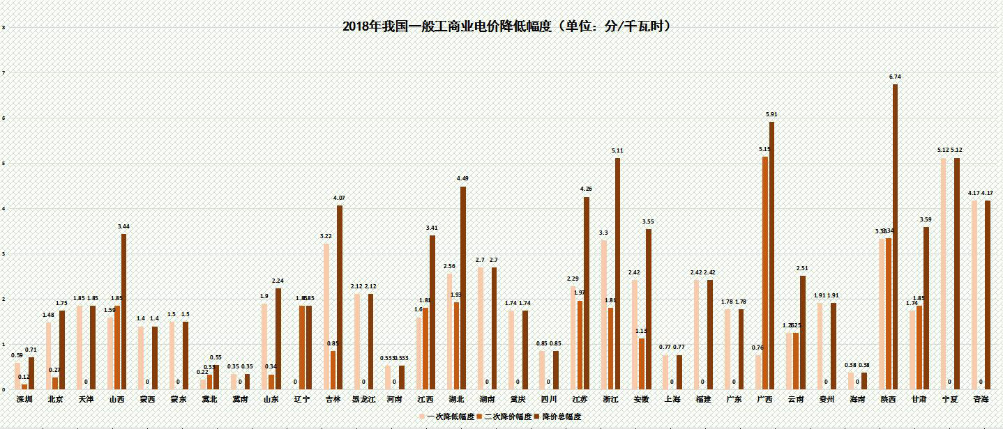 《2018年政府工作報告》提出“一般工商業(yè)電價平均下降10%”目標,歷時4個月,國家發(fā)改委連續(xù)發(fā)布三個降低一般工商業(yè)電價的重要文件,我國各個省(自治區(qū)、直轄市)紛紛下調(diào)一般工商業(yè)電價。