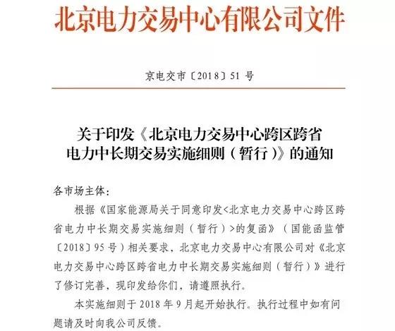 2018年8月21日,北京電力交易中心對(duì)《北京電力交易中心跨區(qū)跨省電力中長(zhǎng)期交易實(shí)施細(xì)則(暫行)》進(jìn)行了完善修訂并印發(fā)。實(shí)施細(xì)則于2018年9月起開(kāi)始執(zhí)行。