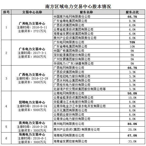 我們從文件中了解到,諸多電力交易中心作為重要的電力交易管理機(jī)構(gòu),它承擔(dān)了國家電網(wǎng)、南方電網(wǎng)與各市場主體之間的橋梁作用。而在之前的北京電力交易中心是國家電網(wǎng)全資建立,廣州電力交易中心是南方電網(wǎng)控股,各?。▍^(qū)、市)電力交易中心也鮮有民間資本注入,電力市場化交易的管理權(quán)限仍然完全把握在兩大電網(wǎng)公司中。南方區(qū)域電力交易中心處于改革最前沿,在建立之初,多以股份制方式建立。大云網(wǎng)以此為例,匯總統(tǒng)計(jì)了廣州及南方五省電力交易中心股權(quán)結(jié)構(gòu)。