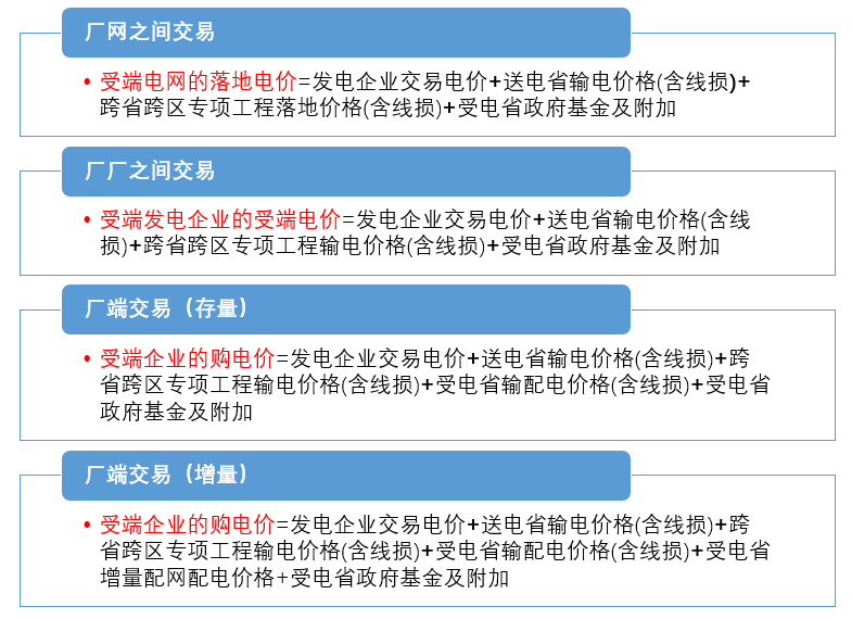 前面提到跨省跨區(qū)電價(jià)按交易雙方構(gòu)成不同,受端落地電價(jià)構(gòu)成會(huì)有不同。具體構(gòu)成如下: