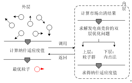 關(guān)于電力市場均衡的求解算法,國內(nèi)外學(xué)者做了許多研究。文獻(xiàn)[6-7]運(yùn)用窮舉法獲取發(fā)電商的最優(yōu)反應(yīng)函數(shù)以探討市場古諾均衡。文獻(xiàn)[8]利用迭代的方法求解納什均衡,但常常因?yàn)槭諗啃圆疃蟛坏骄饨?文獻(xiàn)[9-11]利用Karush-Kuhn-Tucker條件,將發(fā)電商的雙層優(yōu)化問題轉(zhuǎn)換成一組半光滑非線性互補(bǔ)方程組,但是算法轉(zhuǎn)化過程及半光滑方程組的求解過程異常復(fù)雜,中間松弛變量維數(shù)高;文獻(xiàn)[12-15]將發(fā)電商競價(jià)的均衡問題模擬成種群協(xié)同進(jìn)化的過程,采用協(xié)同進(jìn)化算法求解,但發(fā)電商某策略下的收益是隨對(duì)手策略變化的,單純將發(fā)電商的收益作為評(píng)估策略的適應(yīng)度,理論可靠性有待商榷;文獻(xiàn)[16-17]運(yùn)用多項(xiàng)式方程系統(tǒng)算法求解市場存在的混合策略均衡,當(dāng)策略離散度高時(shí)求解時(shí)間也等比增加,且需要對(duì)結(jié)果進(jìn)行驗(yàn)證,不適合進(jìn)行大規(guī)模求解計(jì)算。文獻(xiàn)[18]用多智能體仿真系統(tǒng) (agent-based modeling of electricity systems,AMES)模擬市場均衡,可仿真的結(jié)果并未收斂至納什均衡解。由此,本文提出了一種基于雙層粒子群算法(particle swarm optimization,PSO)求解電力市場均衡的新思路。