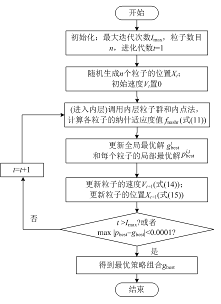 本文運(yùn)用雙層粒子群算法求解電力市場均衡,算法思路如圖1所示。其中,外層采用粒子群算法搜索可行域內(nèi)的所有策略組合,計(jì)算其納什適應(yīng)度值,以此判斷其是否為納什均衡;而計(jì)算策略組合的納什適應(yīng)度值屬于內(nèi)層問題,需要求解“發(fā)電商競價(jià)的雙層優(yōu)化問題”(這是一個(gè)上下層問題,見2.3節(jié))方能解決,內(nèi)層采用粒子群算法和內(nèi)點(diǎn)法結(jié)合求解“發(fā)電商競價(jià)的雙層優(yōu)化問題”。通過內(nèi)外層的配合,從而整個(gè)市場均衡問題通過兩層粒子群