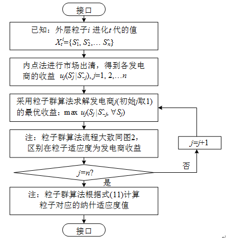 采用粒子群和內(nèi)點(diǎn)法[21-22]求解各發(fā)電商最大化收益的雙層優(yōu)化模型,套用式(11),便可得到組合策略XitXti對(duì)應(yīng)的納什適應(yīng)度函數(shù)值,具體求解流程如圖3所示。其中,內(nèi)層粒子群算法流程與圖2類似,此處不再贅述,區(qū)別在于粒子適應(yīng)度為發(fā)電商收益,粒子位置為單個(gè)發(fā)電商策略。