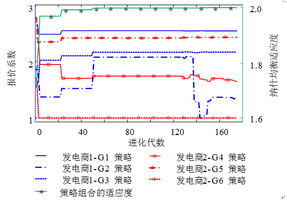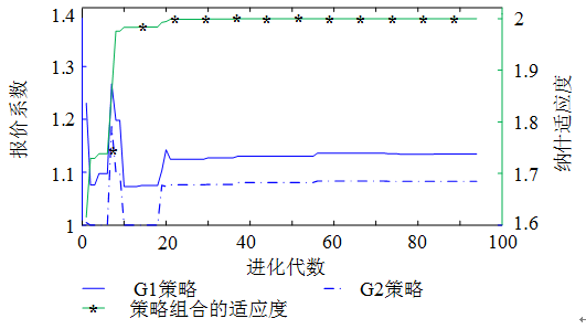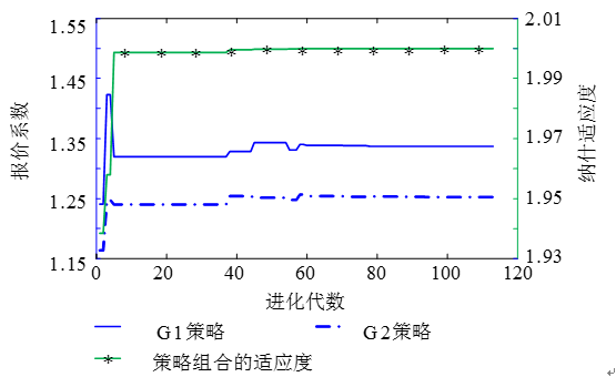 圖7記錄了雙層粒子群算法尋優(yōu)過程中最優(yōu)粒子的策略組合和納什適應(yīng)度值。