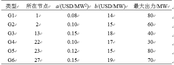 IEEE 30節(jié)點(diǎn)系統(tǒng)包含6個(gè)發(fā)電商,20個(gè)負(fù)荷,41條支路。其中,發(fā)電商成本參數(shù)如表3所示,網(wǎng)絡(luò)拓?fù)浼柏?fù)荷數(shù)據(jù)見附錄。選取3條潮流最大的支路1-2、12-13、15-23,設(shè)置輸電上限15 MW,使其發(fā)生阻塞。