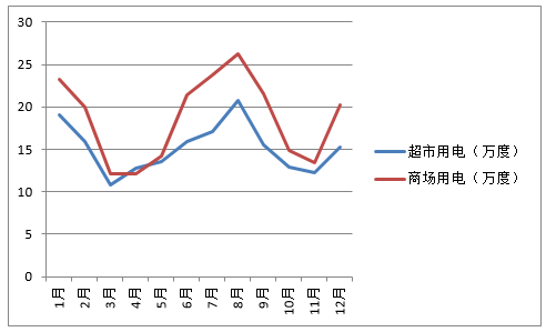 我們調(diào)查了解了部分商場(chǎng)和超市2017年度用電量等相關(guān)情況,圖(一)為某中等規(guī)模的超市及中型商場(chǎng)的用電量走勢(shì),可以看出,商場(chǎng)與超市用電量走勢(shì)大致相同,冬季(12月-次年2月)和夏季(6-8月)用電量較多。這主要與夏季空調(diào)、冬季取暖有關(guān)。