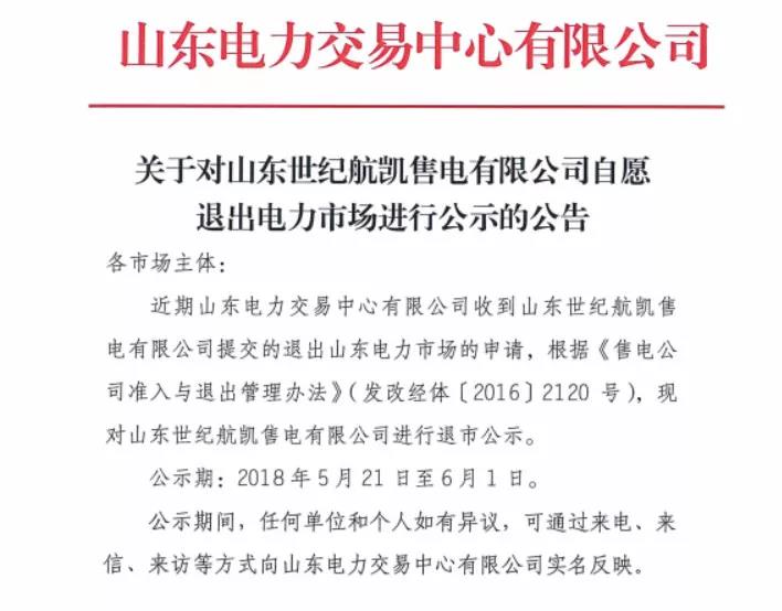 5月21日,山東電力交易中心發(fā)布了一則《關(guān)于對(duì)山東世紀(jì)航凱售電有限公司自愿退出電力市場(chǎng)進(jìn)行公示的公告》,公示期為一個(gè)月,這是繼5月10日