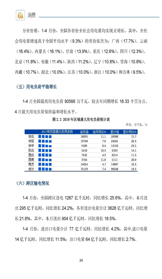 全國(guó)電力生產(chǎn)運(yùn)行與市場(chǎng)分析月度報(bào)告(2018年5月),1-4月份,全國(guó)全社會(huì)用電量21094億千瓦時(shí),同比增長(zhǎng)9 3%,其中4月全國(guó)全社會(huì)用電量5117億