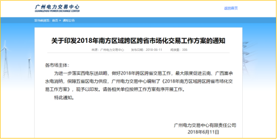 廣州電力交易中心近日編制并發(fā)布了《2018年南方區(qū)域跨區(qū)跨省市場化交易工作方案》,進(jìn)一步落實(shí)西電東送戰(zhàn)略,最大限度促進(jìn)云南、廣西富余水電消納,保障五省區(qū)電力協(xié)調(diào)供應(yīng)為目標(biāo)。