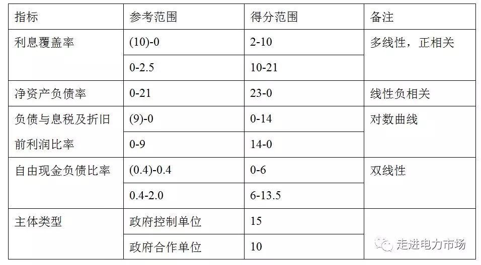 國際上電力市場的信用評價(jià)大都采用該種思路。以PJM為例,市場主體可以由評級機(jī)構(gòu)給出的信用評級得到信用評分,或由PJM根據(jù)其財(cái)務(wù)狀況、經(jīng)營情況、交易行為等進(jìn)行信用評分。在當(dāng)前的PJM信用評分體系中,涉及的評價(jià)指標(biāo)包括:利息覆蓋率,考察市場主體利潤與成本的關(guān)系;凈資產(chǎn)負(fù)債率和負(fù)債與利潤的比率,考慮市場主體資本結(jié)構(gòu),一般來說市場主體的負(fù)債太多會(huì)導(dǎo)致風(fēng)險(xiǎn)過大,太少則盈利能力較差,適當(dāng)?shù)馁Y本結(jié)構(gòu)才是合理的;自由現(xiàn)金與負(fù)債比率,考察市場主體的短期債務(wù)償還能力。此外,還考察電力市場的市場主體是否與政府相關(guān),并根據(jù)密切程度給予不同的加分。這幾項(xiàng)之中,利息覆蓋率及凈資產(chǎn)負(fù)債率的評分的比重較大,負(fù)債與利潤比率、自由現(xiàn)金與負(fù)債比率以及主體類型的比重較小。然后將各項(xiàng)得分加起來得到市場主體的信用評分,見下表。