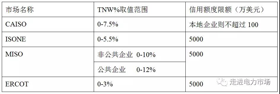 市場主體的信用評分必須不低于50分,才有對應(yīng)的無抵押信用額度,否則無抵押信用額度為零。并且PJM還對不同信用等級的主體設(shè)置了不同的無抵押信用額度限額,最多不得超過5000萬美元。不同的電力市場的TNW%取值是不一樣的,對于給出無抵押信用額度限額的市場,F(xiàn)ERC要求所有電力市場的無抵押信用限額都不得超過5000萬美元。北美幾個(gè)主要電力市場的無抵押信用額度限額如表2所示。