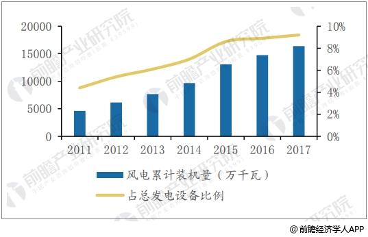 2011年-2017年風(fēng)電累計(jì)裝機(jī)和占比