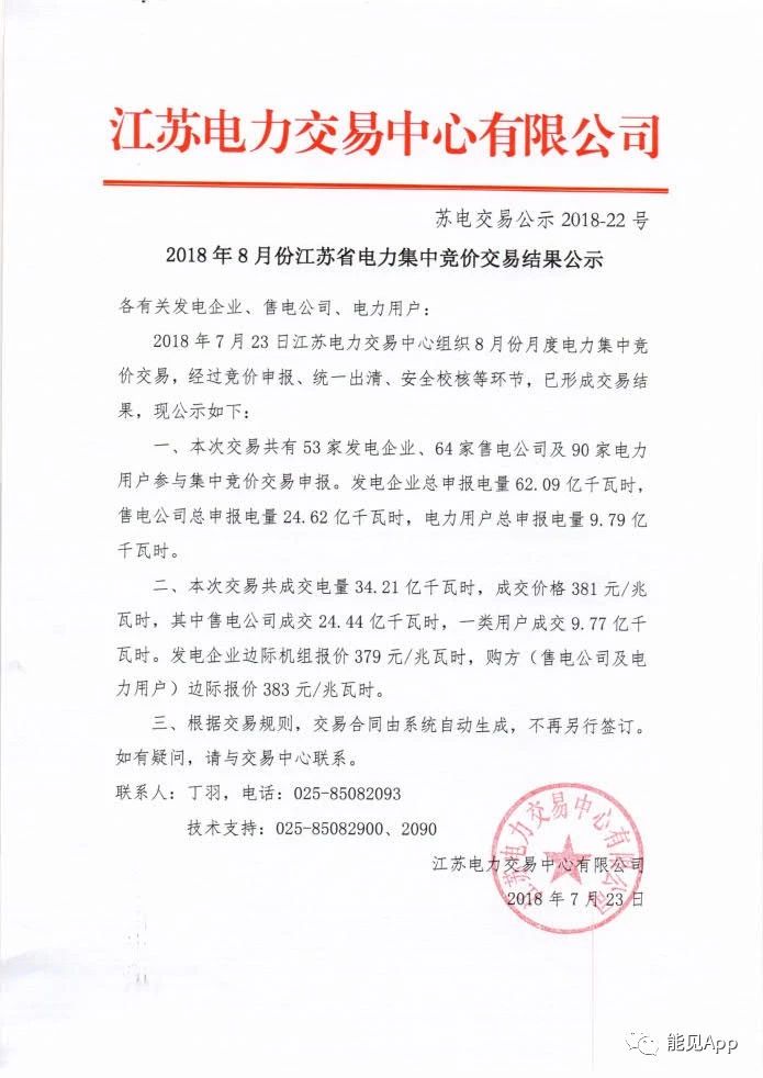 2018年7月23日,江蘇電力交易中心公布了8月份月度集中競(jìng)價(jià)結(jié)果,成交電量規(guī)模34.21億千瓦時(shí),成交價(jià)格381元/兆瓦時(shí),價(jià)差較上個(gè)月8厘上升2厘,回到1分錢/千瓦時(shí)。