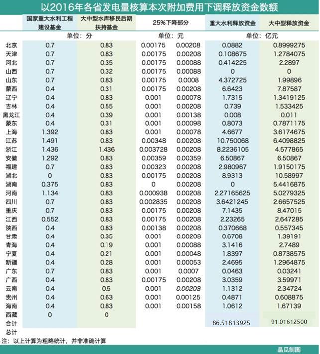 在2017年電價結(jié)構(gòu)調(diào)整時(點擊閱讀),我們就曾簡單計算過基金附加調(diào)整時的變動影響,與上次相同,這次也是國家重大水利工程基金建設(shè)標(biāo)準(zhǔn)征收降低25%,所以沒有2017年各省發(fā)電量數(shù)據(jù)情況下,我們將就用一下2016年的數(shù)據(jù),畢竟只是一個粗略的數(shù)值,從重大水利釋放資金可以看到,這個數(shù)值約為86.15億,所以我們認(rèn)為在90億以上也可以的。