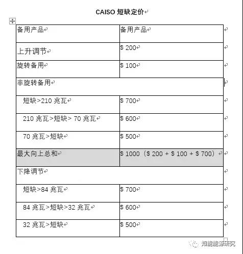 當(dāng)CAISO確定存在或?qū)⒋嬖谶\(yùn)營(yíng)備用不足時(shí),將觸發(fā)短缺定價(jià)機(jī)制,并且將根據(jù)CAISO的稀缺需求曲線中的適當(dāng)值設(shè)定運(yùn)營(yíng)備用的市場(chǎng)出清價(jià)格,詳見(jiàn)下表。