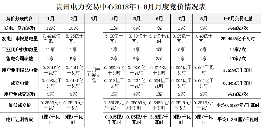 3、貴州月度競價不理想。筆者整理出今年貴州電力交易中心1-8月電力分月競價情況一覽表(見下表)。