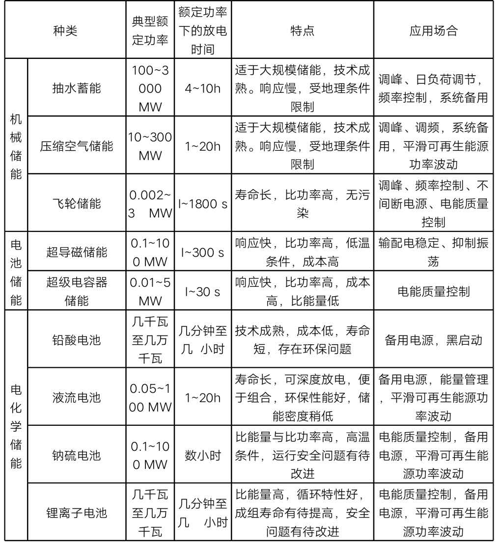 表1 各種儲能技術(shù)的特點和應(yīng)用場合