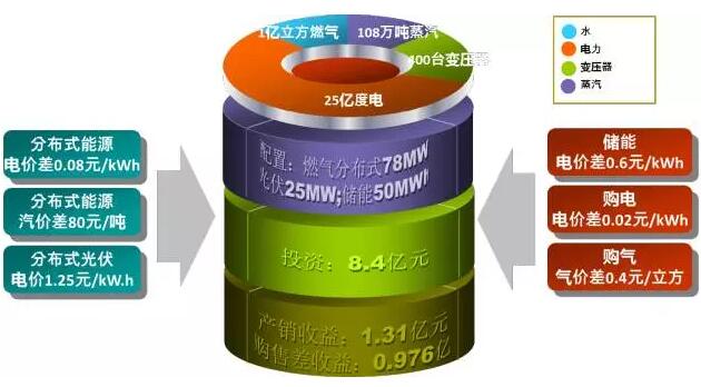 下面以一個理想的案例來說明區(qū)域能源互聯(lián)網(wǎng)的初級盈利模式,如圖6所示??紤]以下情景:一個10平方公里的工業(yè)園區(qū),約100家用能企業(yè),每年需25億度電、1億立方米燃?xì)狻?08萬噸蒸汽、400臺變壓器。在不能使用燃煤電站的前提下,考慮到蒸汽的需求,配置燃?xì)夥植际桨l(fā)電78MW、光伏發(fā)電25MW、儲能25MW,總投資概算約為8.4億。不考慮園區(qū)能源互聯(lián)網(wǎng)的模式,在現(xiàn)有條件下,收益按分布式燃?xì)獍l(fā)電0.08元/kw.h、蒸汽按80元/噸、分布式光伏1.25元/度計(jì)算(數(shù)據(jù)可根據(jù)地區(qū)實(shí)際進(jìn)行調(diào)整),每年能源的產(chǎn)銷收益為1.31億元,分布式燃?xì)?、分布式光伏、儲能的靜態(tài)投資回收期分別約為6.72年、5.09年、8.33年。在考慮園區(qū)能源互聯(lián)網(wǎng)的模式下,整個園區(qū)的綜合能源服務(wù)由一家企業(yè)提供,通過開展購售電、氣業(yè)務(wù),能源購售收益按電0.02元/kw.h、氣0.4元/立方米、儲能電0.6元/度計(jì)算,每年的能源購售差收益為0.976億(含變壓器運(yùn)維等增值業(yè)務(wù)收入0.16億元),這樣年度總收益為2.29億元,靜態(tài)投資回收期將為3.67年,大大提升了項(xiàng)目的盈利能力和用戶粘性。