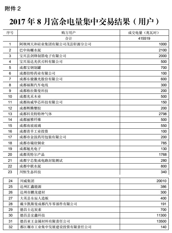 從四川電力交易中心獲悉,2017年7月24日和25日,四川電力交易中心分別組織開(kāi)展了8月份月度直購(gòu)電和富余電量交易。共有91家用電企業(yè)和150家發(fā)電企業(yè)成交,成交電量85564兆瓦時(shí)。具體公告如下: