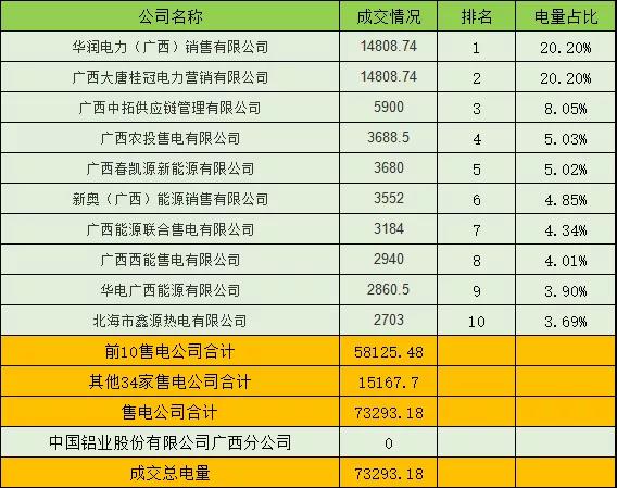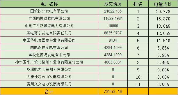 無約束成交電量為73293 18萬千瓦時,統(tǒng)一出清價格為38分 千瓦時。較廣西燃煤機組標桿上網(wǎng)電價42 07分 千瓦時下降4 07分 千瓦時。發(fā)電廠申報電量110994 2408萬千瓦時、用電企業(yè)申報電量73293 18萬千瓦時,供需比為1 51:1 0 , 呈供大于求狀態(tài)。