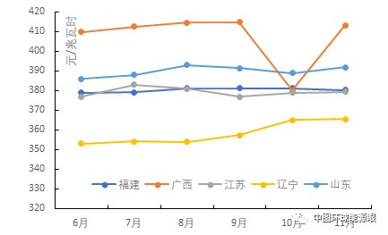 遼寧、山東、江蘇、福建、廣西5個重點地區(qū)電力11月月度集中競價交易的加權(quán)平均電價為383 86元 兆瓦時。