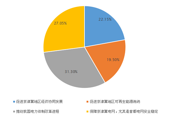如圖1所示,31.30%的受訪者表示,京津冀區(qū)域電力直接交易將有效推動我國電力體制改革進(jìn)程;27.05%的受訪者認(rèn)為,此舉將進(jìn)一步保障京津冀地區(qū)特別是首都電網(wǎng)的安全穩(wěn)定;22.15%的受訪者認(rèn)為,此舉將對京津冀地區(qū)經(jīng)濟(jì)協(xié)同發(fā)展起到促進(jìn)作用;19.50%的受訪者認(rèn)為,此舉將對京津冀地區(qū)可再生能源消納有所促進(jìn)。