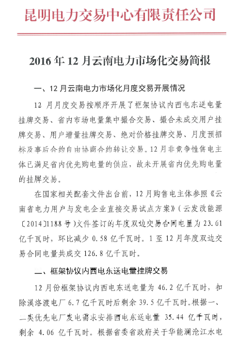 2016年12月云南電力市場化交易簡報