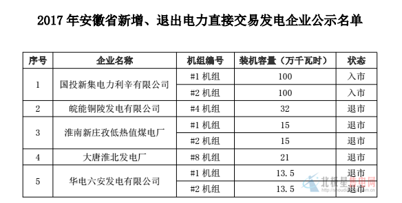 安徽2017年新增、退出電力直接交易發(fā)電企業(yè)公示名單
