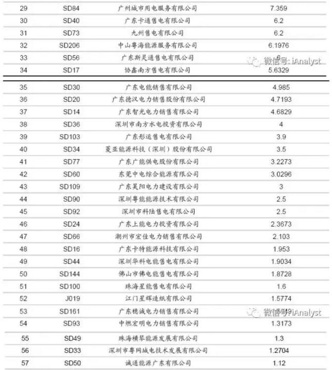 本次交易成交價差為-0.0645元/度,電廠售電側(cè)釋放電改紅利54億元。本次交易共有60家發(fā)電企業(yè)、82家售電公司、6家電力用戶參與,其中售電公司總成交電量為815億度,占雙邊協(xié)商交易規(guī)模的94%,成交量前7名售電公司均為首批公示售電公司,總成交規(guī)模為448.31億度,發(fā)電資源與客戶資源優(yōu)勢依然明顯。