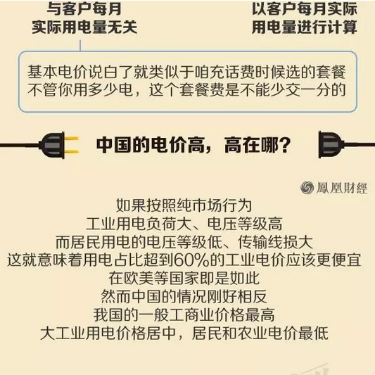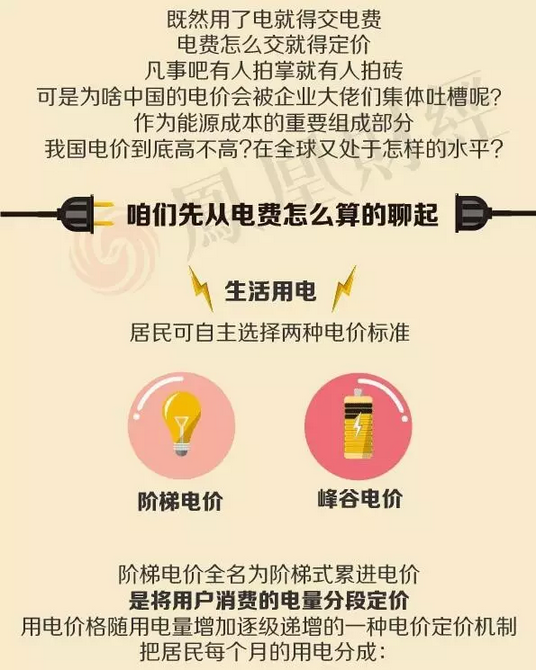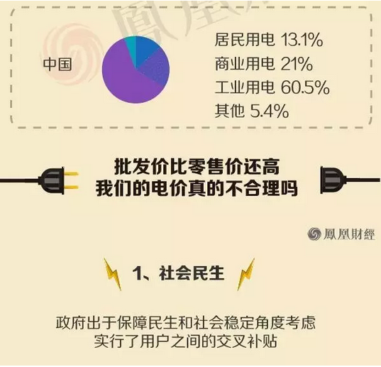 為什么企業(yè)家紛紛認為中國的電價高?中國的電價高,高在哪?其實中國的居民電價不算特別高,工商業(yè)電價比較高。請看鳳凰財經(jīng)制作的圖表: