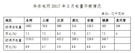 2017年3月,根據(jù)快報數(shù)據(jù)華東全網統(tǒng)調發(fā)電量1092億千瓦時,同比增長7.1%。四省一市統(tǒng)調發(fā)電量同比增速分別為:上海7.5%、江蘇8.2%、浙江7.9%、安徽2.7%、福建7.5%、直代管4%。華東全網統(tǒng)調用電量1150.3億千瓦時,同比增長6.9%,四省一市統(tǒng)調用電量同比增速分別為:上海4.7%、江蘇5.9%、浙江8.8%、安徽6.8%、福建8.4%。