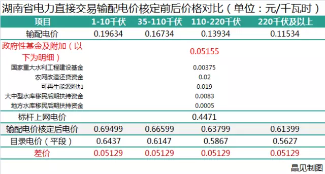 湖南省發(fā)改委于2017年1月1日便開始執(zhí)行輸配電價(jià)核定后的銷售電價(jià)。晶見計(jì)算得出,如果依據(jù)湖南省發(fā)改委關(guān)于省電網(wǎng)2017-2019年輸配電價(jià)有關(guān)問(wèn)題中通知及其附件內(nèi)提到的“參與電力市場(chǎng)的用戶購(gòu)電價(jià)格由市場(chǎng)交易價(jià)格、輸配電價(jià)(含線損和交叉補(bǔ)貼)和政府性基金組成;未參與電力市場(chǎng)的用戶,執(zhí)行政府規(guī)定的電價(jià)”,參與直接交易的電力用戶或者售電公司就需要繳納比目錄電價(jià)更高昂的電費(fèi),差價(jià)將達(dá)到5.1分。
