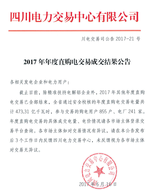 四川電力交易中心發(fā)布了《2017年年度直購(gòu)電交易成交結(jié)果公告》,公告中稱(chēng),四川省通過(guò)安全校核的年度直購(gòu)電交易電量共計(jì)471.31億千瓦時(shí),參與交易的購(gòu)電用戶(hù)855戶(hù)、電廠241家。詳情如下: