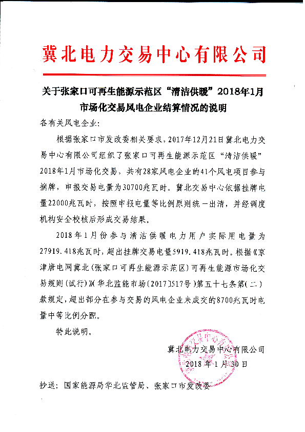 《關(guān)于張家口可再生能源示范區(qū)“清潔供暖”2018年1月市場化交易風(fēng)電企業(yè)結(jié)算情況的說明》
