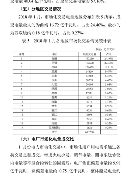 2018年1月云南電力交易月報(bào):省內(nèi)市場(chǎng)共成交電量70.04億千瓦時(shí) 同比增長(zhǎng)39.78%