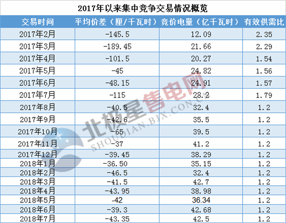 值得注意的是,本月價差再度持續(xù)走低,平均價差僅為-43.35厘/千瓦時,與2018年4月價差持平,成交量與上月相比基本持平。7月份市場用電總需求電量為146.5億千瓦時,扣除年度合同電量104億千瓦時后,集中競爭電量需求為42.5億千瓦時,7月集中競爭電量需求扣除必開頂峰電量19.9億,已申請強制成交電量1.9億千瓦時后,有效競爭電量需求為20.7億千瓦時。
