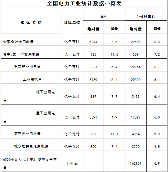 在國(guó)家能源局官網(wǎng)獲悉,1-6月份全國(guó)電力工業(yè)統(tǒng)計(jì)數(shù)據(jù)發(fā)布,1-6月全國(guó)全社會(huì)用電量29508億千瓦時(shí),同比增長(zhǎng)6.3%。全國(guó)售電量23595億千瓦時(shí),同比增長(zhǎng)6.9%。詳情如下:
